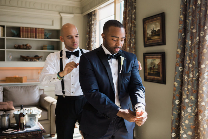 Before we arrive, we ask that the guys get dressed, but that that the groom keep his jacket, tie, shoes, and any of his special details off, so that we can photograph him putting those things on.